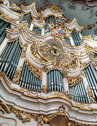 In grandiosem Einklang mit dem Kirchenraum krönt die weltberühmte Barock-Orgel die Fürstliche Abteikirche Amorbach. Die 1774 bis 1782 von den Gebrüdern Stumm aus Rhaunen-Sulzbach im Hunsrück erbaute Orgel ist das grösste Instrument, das diese Werkstatt im Laufe ihres 200-jährigen Bestehens je verlassen hat. Deshalb war das Werk bereits am Ende des 18. Jahrhunderts ein Publikumsmagnet und eine der grössten und klangprächtigsten Orgeln Europas. Sie verfügt heute über vier Manuale, Pedal und 5116 Pfeifen in 66 Registern mit einem Glockenspiel. |