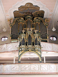 Die Orgel der St. Gallus-Kirche kann auf eine 300-jährige Geschichte zurückblicken. Sie geht in ihren ältesten Teilen wie z. B. dem goldverzierten Gehäuse und einigen erhaltenen Registern auf den Mainzer Orgelbaumeister Johann Jakob Dahm (1660–1727) zurück. Dahm war Orgelbaumeister des Mainzer Domkapitels und hatte u. a. Orgeln für den Mainzer Dom, das Kloster Eberbach im Rheingau und die Weilburger Schlosskirche angefertigt. |